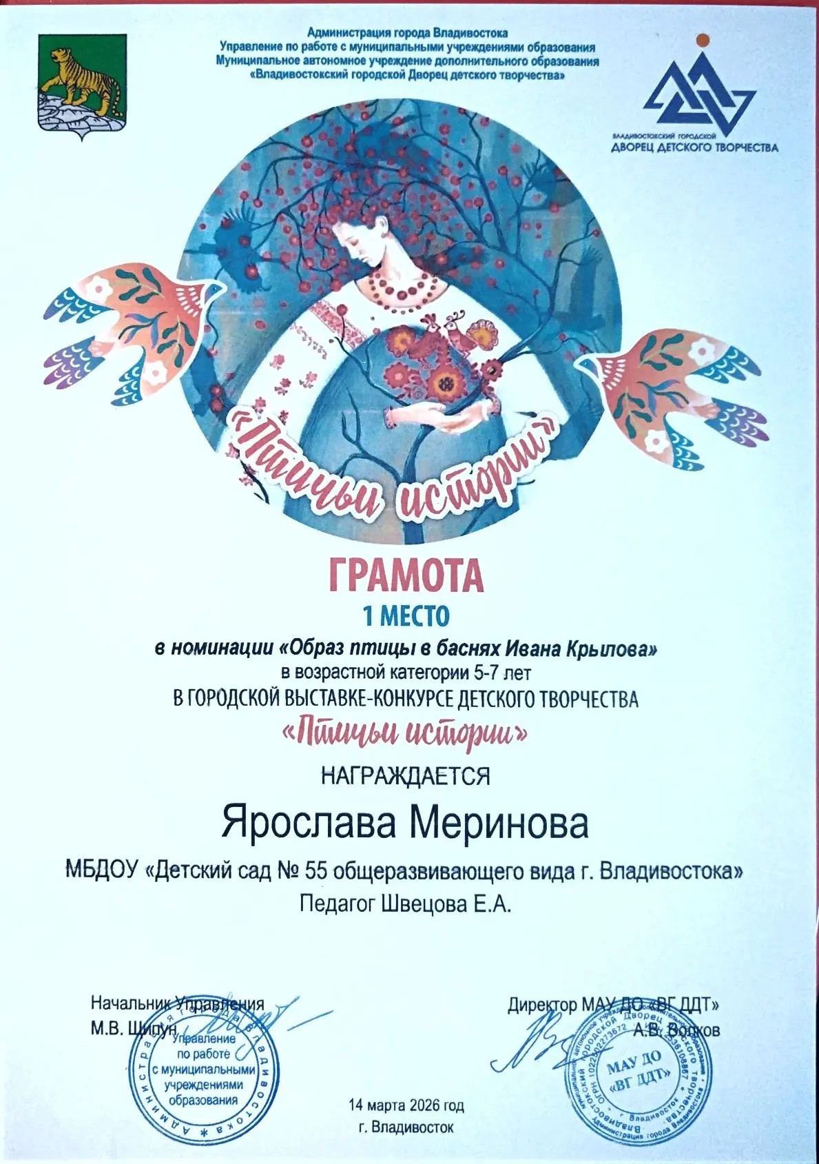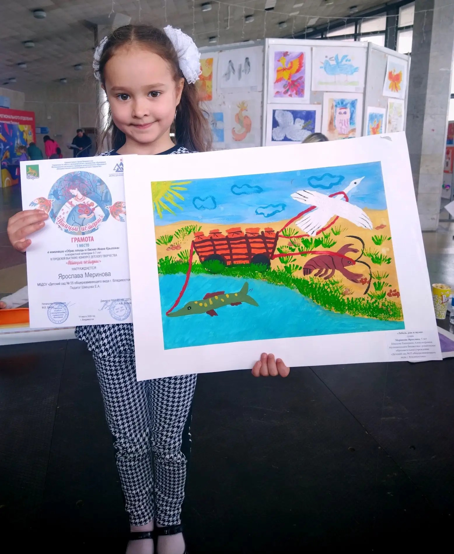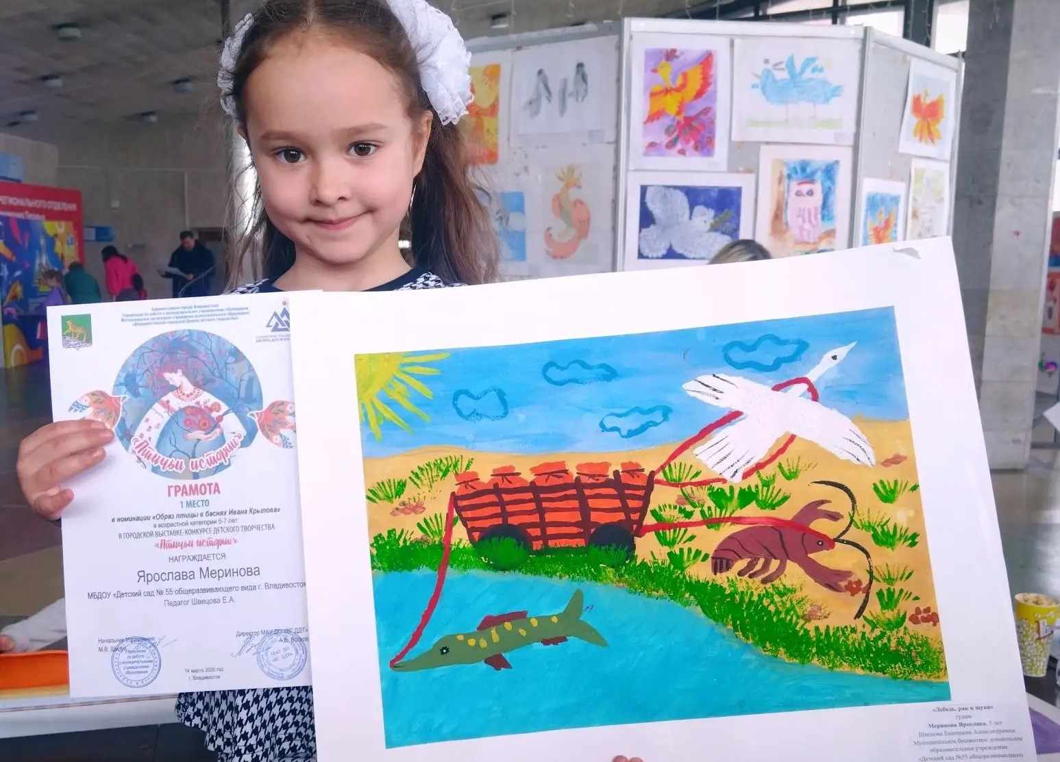 Воспитанница Детского сада № 55 г. Владивостока 5-летняя Ярослава Меринова (педагог - Швецова Е. А.), также занимающаяся в ДХШ № 3 и посещающая три творческих клубных формирования Дома культуры "Традиции и современность", завоевала звание лауреата I степени городской выставки-конкурса "Птичьи истории", состоявшейся во Дворце детского творчества г. Владивостока.